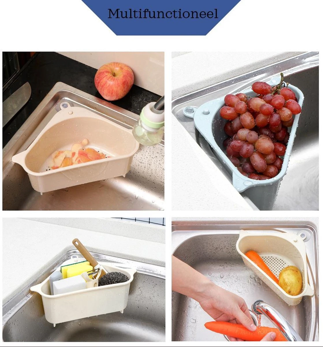 Het opvangbakje is voor veel verschillende doeleinden te gebruiken namelijk; tijdens het koken de schillen van de groenten in op te vangen. Je kunt er je groenten en fruit in wassen. Maar ook ideaal voor het ontdoen van etensresten in de pan die niet meer in je spoelbak belanden maar in de zeef. Vind je het handig om je afwasspullen erin te bewaren? Ook dat kan! Multifunctioneel dus!