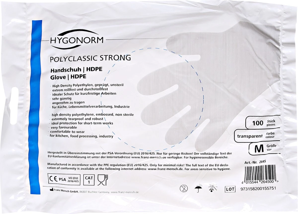 De HDPE handschoen poedervrij Polyclassic Strong is zeer comfortabel om te dragen en biedt een ideale bescherming voor kortdurende werkzaamheden. Uitermate geschikt voor verwerking van voedsel en is bovendien geur- en smaakloos. Bestemd voor dagelijks gebruik in de voedingsmiddelenindustrie, voor keukens, maar ook als dieselhandschoen bij tankstations of in medische ruimtes.