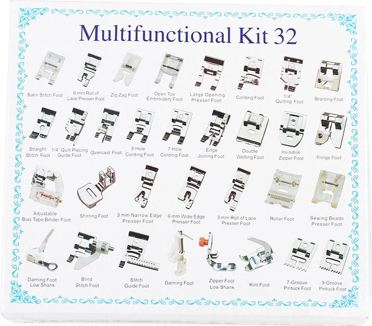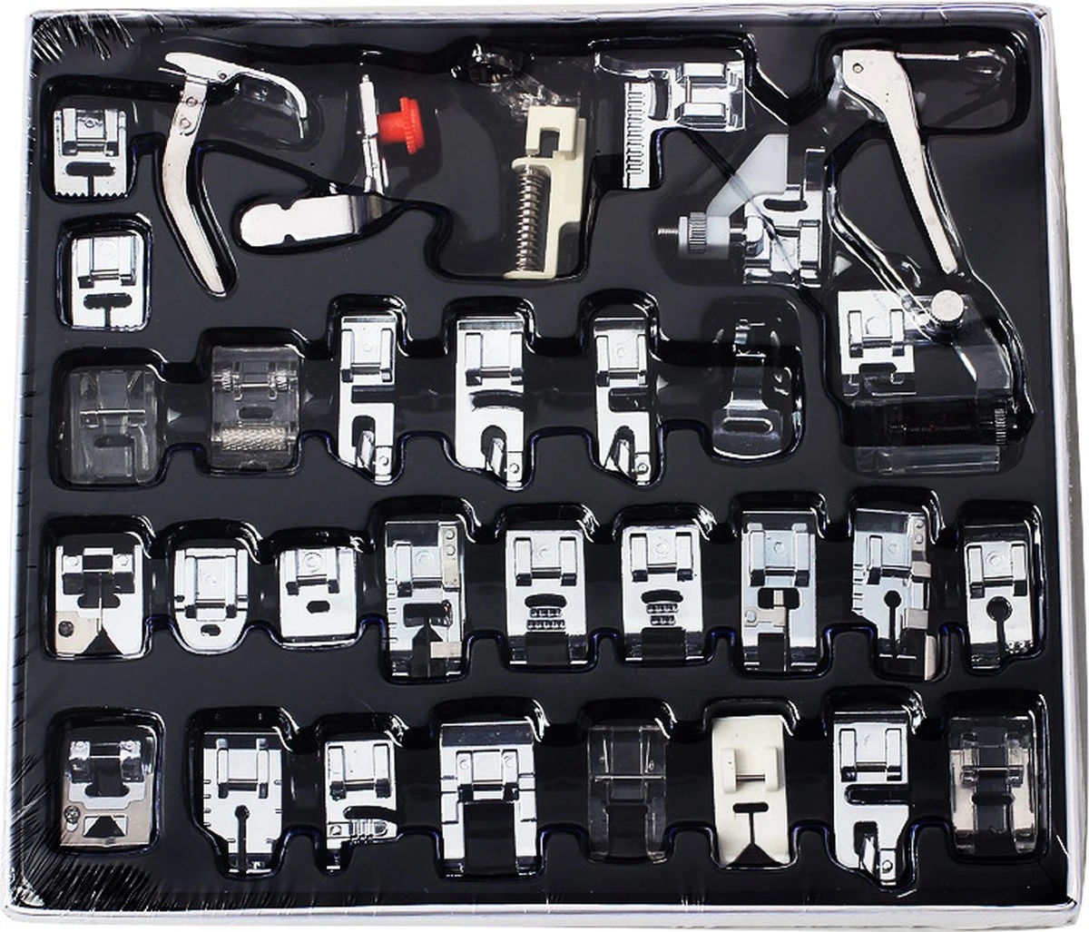 Deze set bevat 32 van de meest populaire voetjes om rechte steken, precieze lijnen en prachtige projecten te naaien, deze set bestaat uit de volgende naaivoetjes: