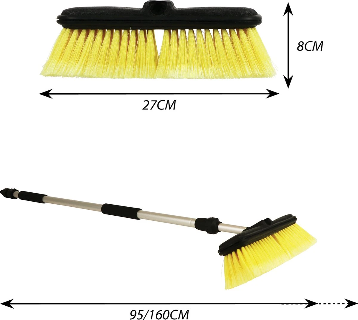 - Telescopische steel: Deze wasborstel heeft een uitschaafbare steel van 95cm tot 160cm waardoor je gemakkelijk jouw auto, caravan, camper of bestelbus kan wassen.